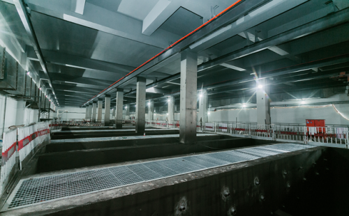 西安市第三污水處理廠并不只是簡單將地上的污水處理廠“下沉”,而是在充分考慮各類安全風險等因素后,重新統(tǒng)籌功能分區(qū),實現資源整合的最優(yōu)配置。項目采用分層布置形式,地下一層為操作層,為設備調控中心和人力檢修中心,地下二層為水處理構筑物和綜合管廊,污水處理廠的曝氣池、沉淀池等在這里“一應俱全”。同時,項目團隊結合施工方案對地下空間進行多維度優(yōu)化,形成立體三維布置,通過優(yōu)化工藝流程、重組單元組團、修改構筑物布局等方式,提升空間利用效率,將項目占地用地減少了三分之二。